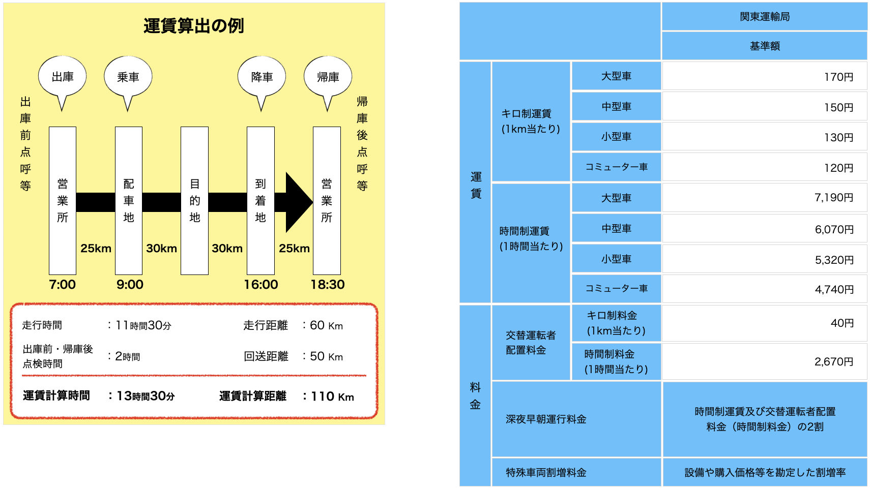 時間制運賃とキロ制運賃を合算することで適切な運賃料金を計算しています。